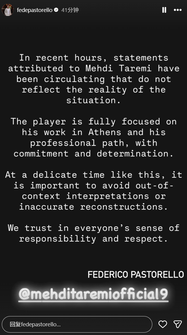 经纪人费德里科·帕斯托雷洛写道:“近期流传的关于迈赫迪·塔雷米的言论不符合实际情况。这位球员正以承诺与决心,完全专注于他在雅典的工作和他的职业道路。